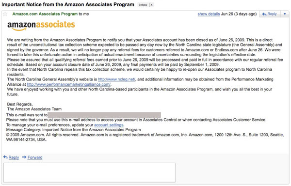 We are writing from the Amazon Associates Program to notify you that your Associates account has been closed as of June 26, 2009. This is a direct result of the unconstitutional tax collection scheme expected to be passed any day now by the North Carolina state legislature (the General Assembly) and signed by the governor….