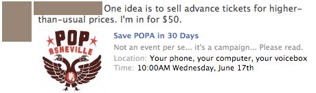 someone on facebook has the audacity to suggest (during a recession where i know several unemployed designers & cultural creatives) that people pay $50 for advance all-access tickets to pop asheville (last january the price was $15 for an all-access wristband). i suspect the person in question has completely zero, i repeat, zero marketing or events-planning experience.
