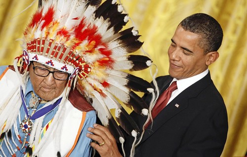 deltafoxtrot: inothernews: FOREBEAR, AND LEGACY President Barack Obama presents the Medal of Freedom to Chief Joseph Medicine Crow during a ceremony in the East Room of the White House in Washington, DC. Obama presented the medal, the highest civilian honor in the United States, to 16 recipients during the ceremony. Medicine Crow, 95, became the first of his tribe to receive a master’s degree, in anthropology. He is the oldest member of the Crow and the tribe’s sole surviving war chief – an honor bestowed for a series of accomplishments during World War II. (Photo: Chip Somodevilla / Getty via the Chicago Tribune)