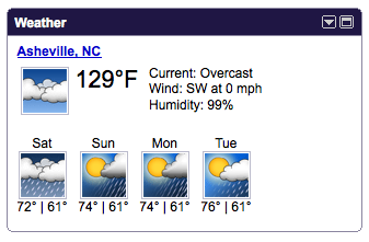 the internet is correct checking my igoogle this morning, i find that it is 129 outside! another example that everything on the internet is correct. Rate this:Share this: Email a link to a friend (Opens in new window) Email Print (Opens in new window) Print Share on LinkedIn (Opens in new window) LinkedIn More Share on Tumblr (Opens in new window) Tumblr Share on X (Opens in new window) X Share on Facebook (Opens in new window) Facebook Share on Pinterest (Opens in new window) Pinterest Like Loading... Related