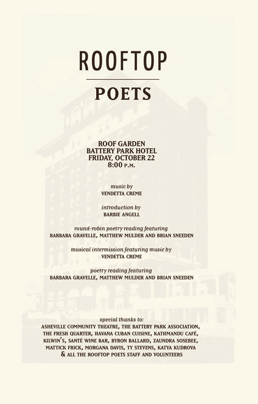 Few people have access to the Battery Park Hotel’s Roof Garden. Join us for a fine evening of poems, songs and full-moon revelry.