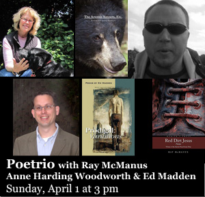 National Poetry Month begins at Malaprop’s Bookstore/Cafe with Poetrio this Sunday at 3:00 p.m. This month’s featured poets include Ed Madden, Ray McManus and Anne Harding Woodworth.