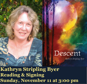 Poetry reading and booksigning event with Kathryn Stripling Byer, former North Carolina Poet Laureate and another favorite here at Malaprop’s.  On November 11 she will read from and sign DESCENT, a collection of poems described as “navigating the dangerous currents of family and race,” in which Byer “confronts the legacy of southern memory, where too often ‘it’s safer to stay blind.'”