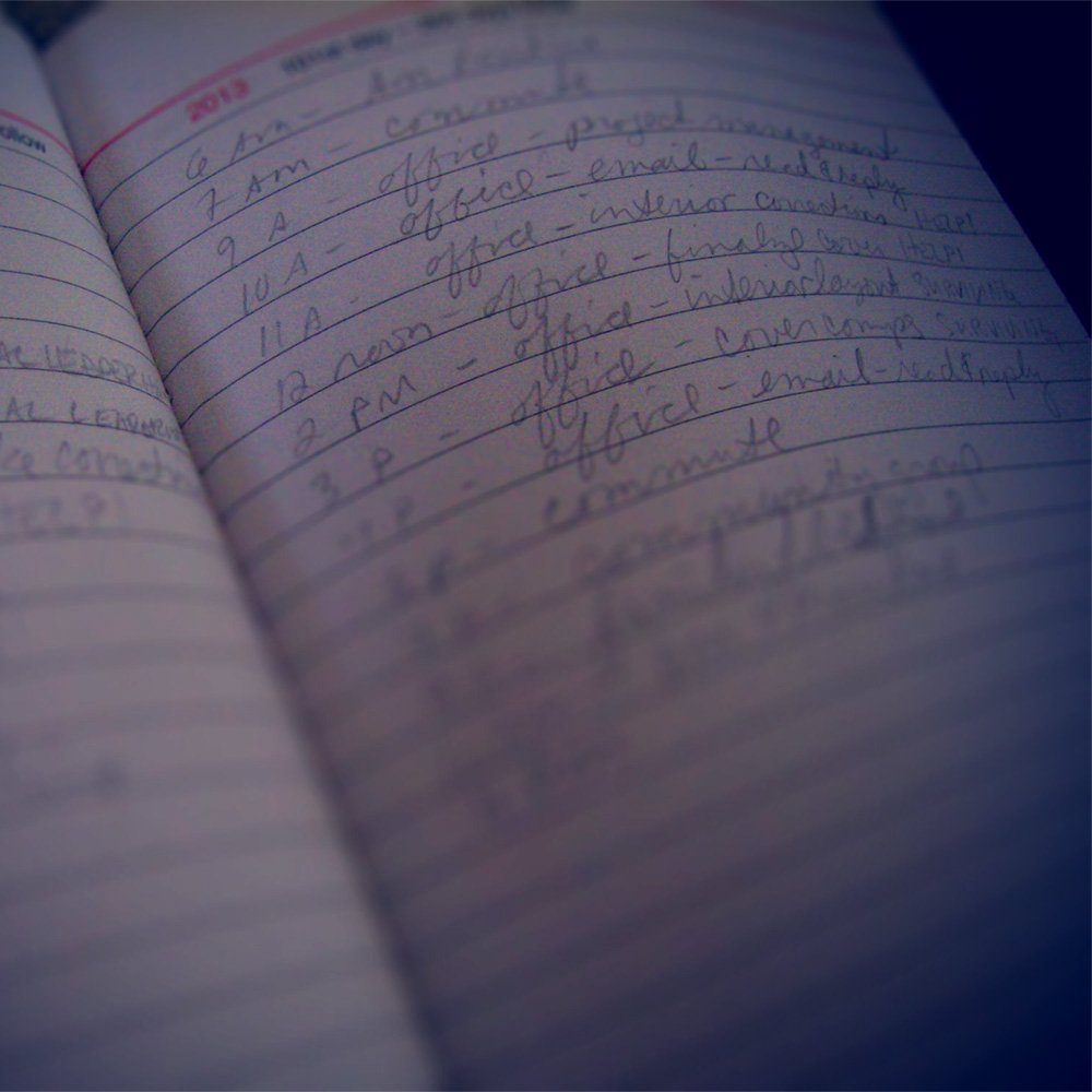 First thing I do when I get to the office is make a list. This is a combination of project management and mind-sweeping. This activity allows me to organize and prioritize large and small tasks for the day and week.