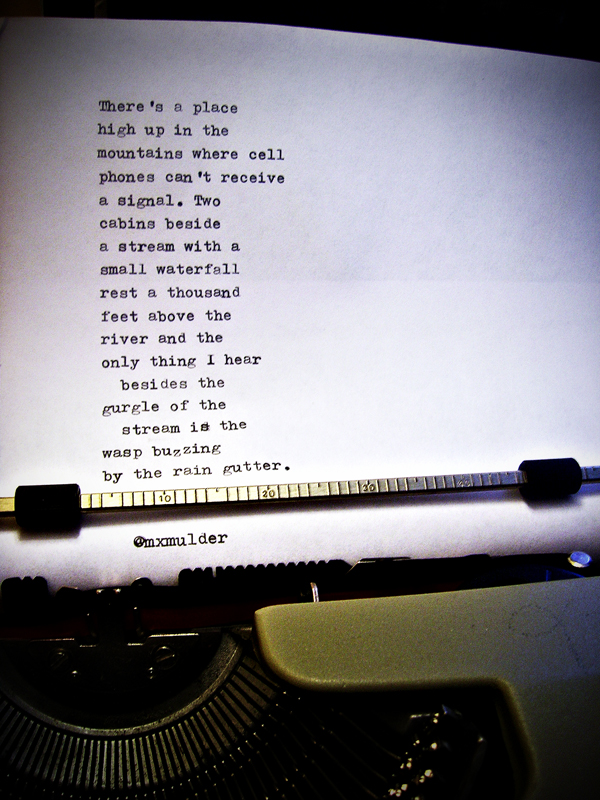 Grabbing a sheet of paper from the recycled bin, I feed the sheet into an old manual typewriter and began composing a manuscript on the spot. The kidlingers watched at a distance and then approached to watch the keys striking the paper. Their amusement fueled the writing and from time to time I would ask them for a color or word choice.