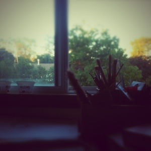 Last Friday night. Using natural light, I worked on an illustration until sunset. Without a formal art studio, the best place to draw with pen and ink and to paint with watercolor is at the east window. As the time grows close to the longest day of the year, this allowed for more time spent doing art work. But when the light fades it is time to switch tasks and clean brushes and pens.