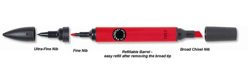 [2] It is a challenge to purchase the old style triple nib markers. Here is one source: AOE Artworld.
