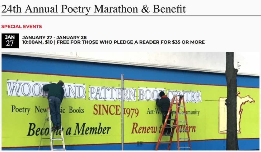 The 24th Annual Poetry Marathon Benefit Reading for Milwaukee’s Woodland Pattern Book Center is next weekend, Saturday, January 27, 2018.