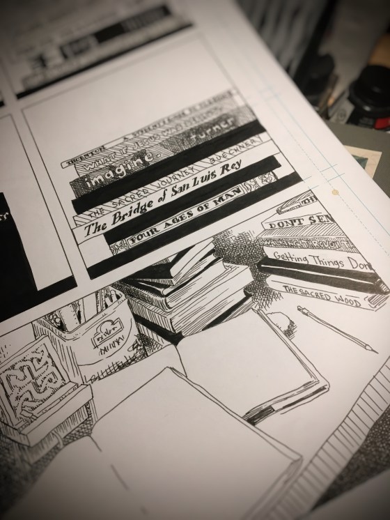 In order to answer a request (Where may I find your art work?), I drew the above page last weekend. Inspired by Jane Mount’s Ideal Bookshelf, I managed to draw the stacks of books on my desk by the bedroom window. At least fifty books. So many books. So little time. I enjoyed the exercise. It felt good to pencil a sketch, flesh out the details, and ink the page.