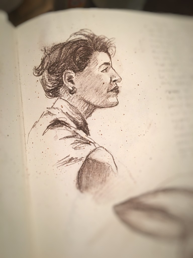 The sketch of a female profile. To be used in a composition inspired by a Luther Terry painting. An allegory. But who should model for the composition’s three figures? Many sketches. Poses. Lighting. All collected in thick hardcover black sketch books. One sketch earns a few minutes of consideration. Maybe. . .
