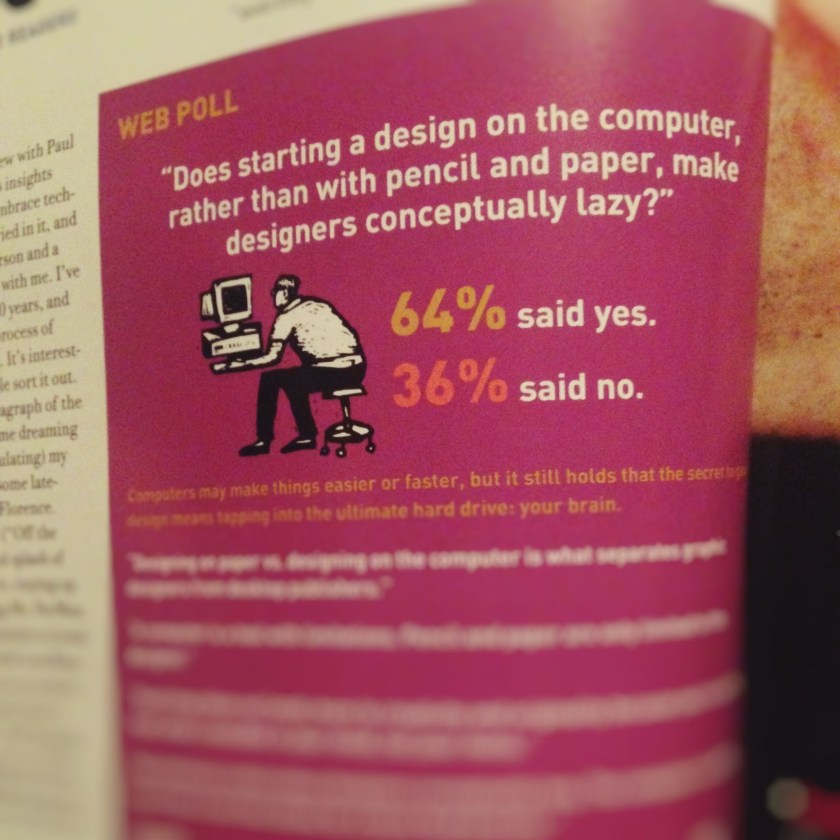 “Does starting a design on the computer… make designers conceptually lazy?” Vintage graphic design print magazine web poll Rate this:Share this: Email a link to a friend (Opens in new window) Email Print (Opens in new window) Print Share on LinkedIn (Opens in new window) LinkedIn More Share on Tumblr (Opens in new window) Tumblr Share on X (Opens in new window) X Share on Facebook (Opens in new window) Facebook Share on Pinterest (Opens in new window) Pinterest Like Loading... Related