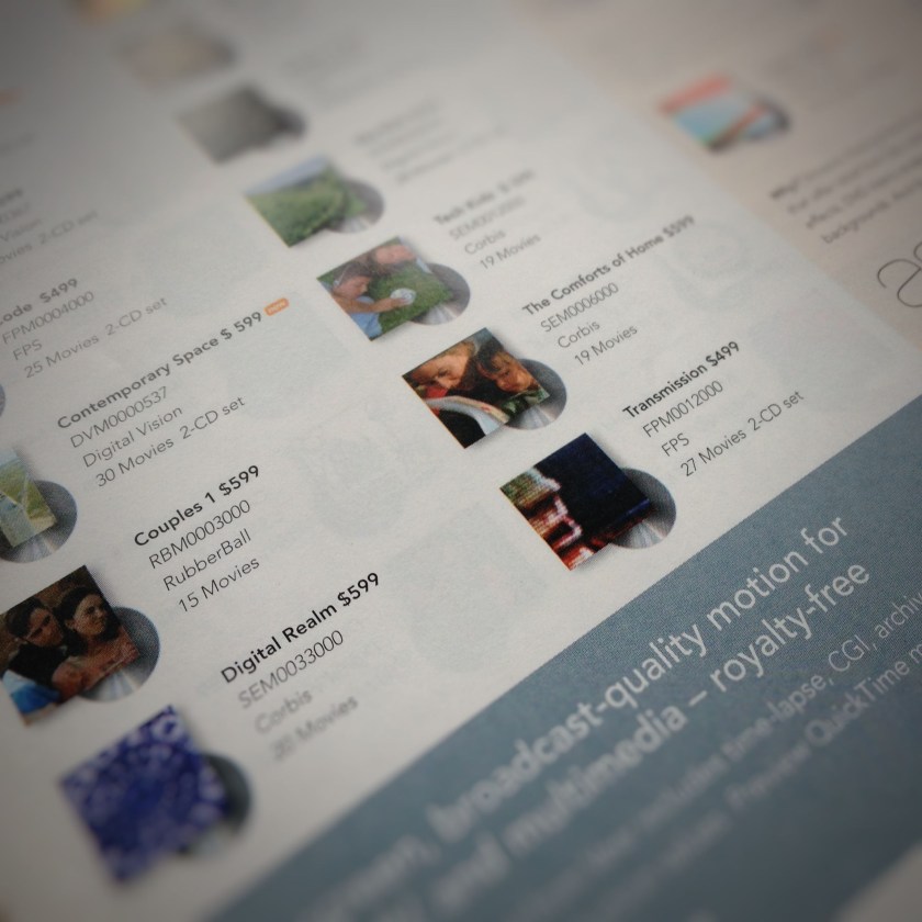 Stock photo CDs catalog page Corbis stock photo CDs on sale for $599 circa 2004 Share this: Email a link to a friend (Opens in new window) Email Print (Opens in new window) Print Share on LinkedIn (Opens in new window) LinkedIn More Share on Tumblr (Opens in new window) Tumblr Share on X (Opens in new window) X Share on Facebook (Opens in new window) Facebook Share on Pinterest (Opens in new window) Pinterest Like Loading...