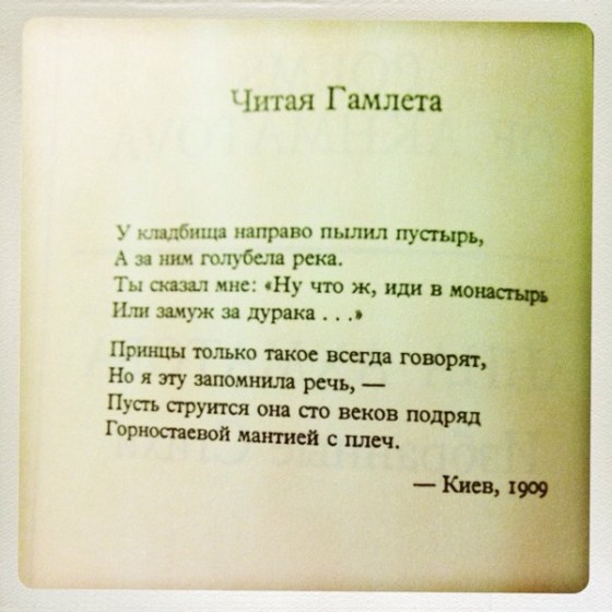 One book I have been reading is a bilingual collection of poems by Anna Akhmatova. The modernist approach Akhmatova displayed in a Russian poem about an English play — Hamlet — amuses me. The line that gets me every time I read it is: “It was the sort of thing that princes always say.”