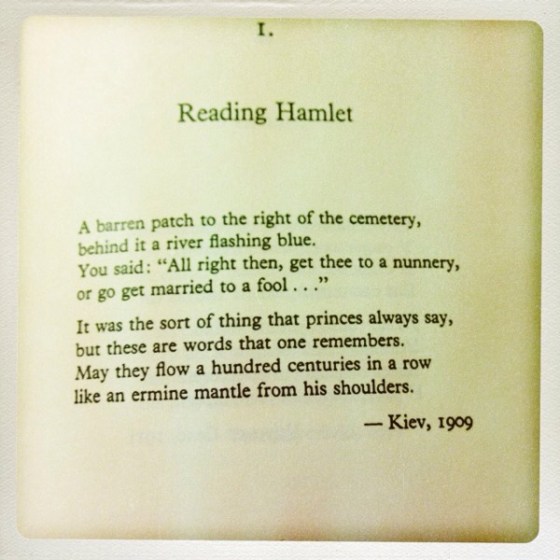 Like a single track on an album, I return to a poem by Anna Akhmatova. A Russian poem about an English play — Hamlet. The line that gets me every time I read it is: