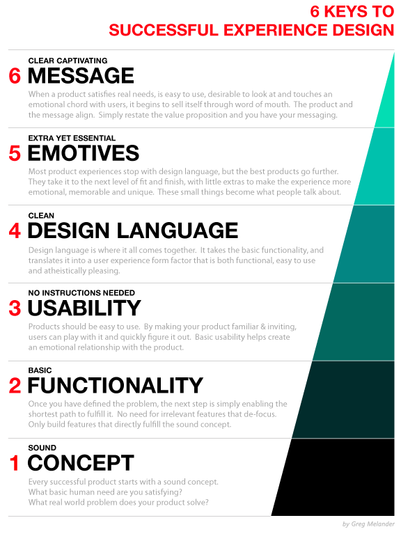 This may seem a bit academic but for me it is pretty fundamental to remember when doing experience design. I put this checklist together to remind me why some experiences fail. Usually they are missing one or more parts of this experience design pyramid. Do all 6 and your experience is like magic!